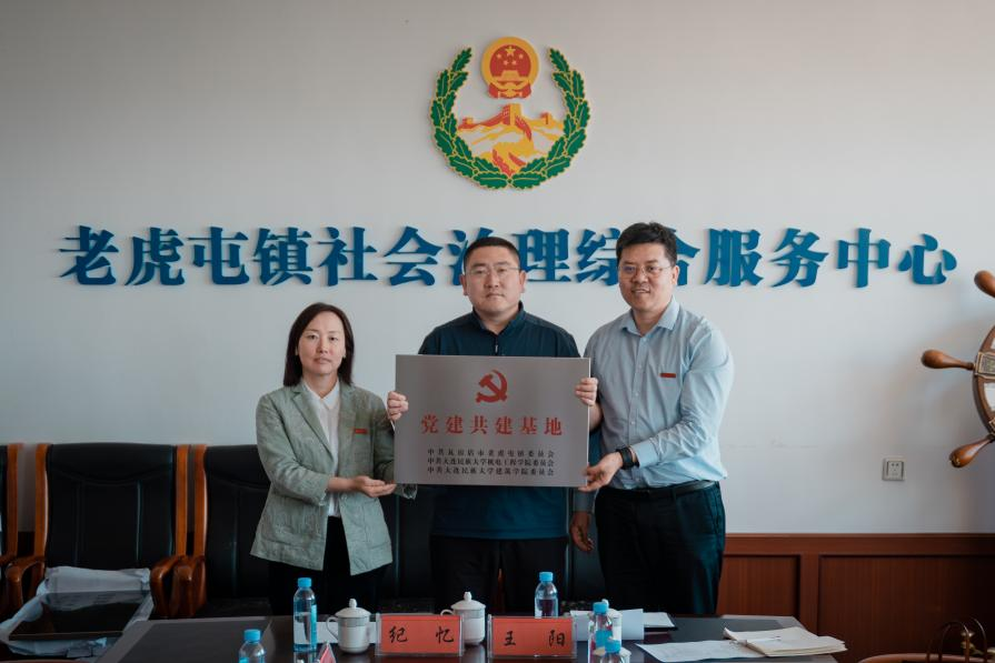 座谈会上,机电工程学院党委、建筑学院党委为瓦房店市老虎屯镇授“党建共建基地”牌。