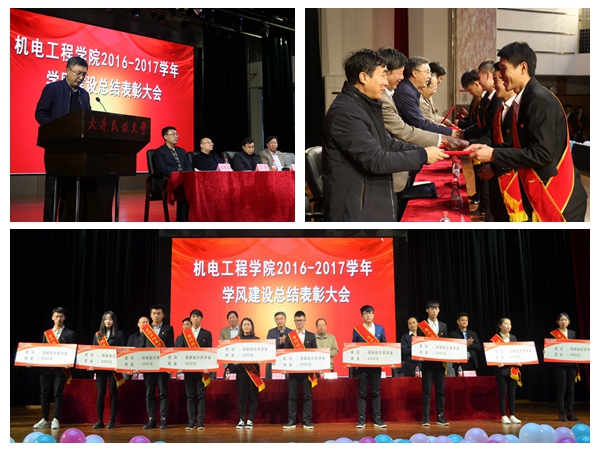 表彰大会在国歌中拉开帷幕。副院长张涛宣读《关于表彰机电工程2016-2017学年度各级各类奖学金、先进集体及先进个人的通报》。副院长刘岩川宣读《关于表彰机电工程2016-2017学年度学生科研创新先进个人的通报》。与会领导向获奖班级及学生代表颁发荣誉证书。国家励志奖学金获得者、“大连市三好学生”杨正凯同学讲述了自身学习和参与国家竞赛的经历,鼓励同学们不忘初心,勇于追梦。“大连市先进班集体”自动化151班代表李建呈分享了班级建设方面经验,通过班级同学共同努力,班级及格率达到100%,21人获得奖学金,16人获得省级以上竞赛奖励。研究生代表韩俊号召同学们要有工匠精神,在为人诚恳、学业求实、工作务实上下苦工。2007届毕业生拓跋振中代表优秀校友发言,分享了毕业十年来的工作经历和感悟,希望同学们提早做好学业规划,努力提升综合素质,为就业做好准备。