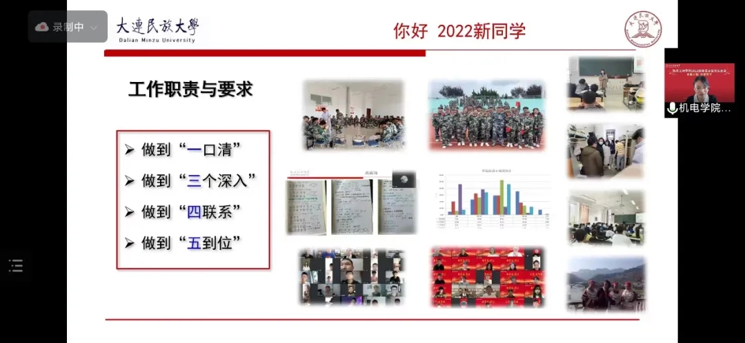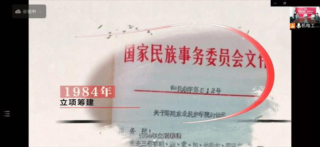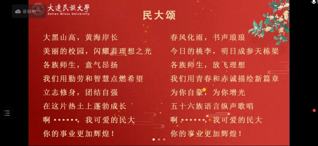 六是上好爱校荣校第一课。充分发挥线上平台优势,在家长会中现场播放大连民族大学校歌《民大颂》,通过屏幕共享方式展示了《民大颂》的歌词内容。