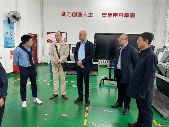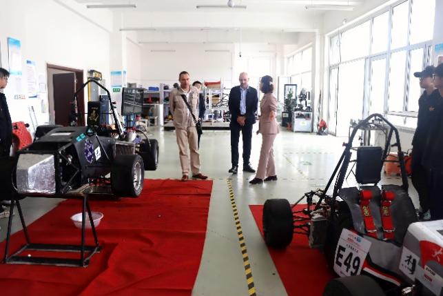 布林德尔·乔纳森博士等在学校国际交流合作处处长张志刚、学院院长张涛、副院长高天一、唐建波、郑琳等陪同下参观了学院智能制造现代产业学院、工程训练中心、“民族之魂”方程式赛车队等实验实践基地。