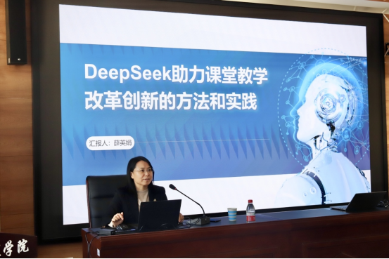 培训中,薛英娟主任就DeepSeek助力课堂教学改革创新的方法和实践向各位老师进行了汇报,汇报围绕DeepSeek在教学中的应用开展,演示了借助AI创建智能体的操作方法。随后,郭惠媛培训师基于超星学习通平台对各位老师进行了AI赋能智慧课程建设和课堂教学改革培训,培训强调了智慧课程系统融合了生成式人工智能、大数据等前沿信息技术。最后,我院老师就推动教育数字化转型问题与薛主任和郭老师展开了讨论,在讨论环节中,教师们积极参与,针对如何在实际教学中落实数字化转型提出了许多宝贵的意见和建议。