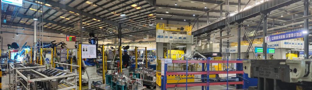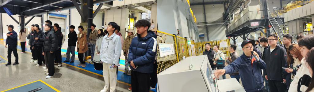 在企业技术负责人的引导下,学生们先后走进生产车间、焊接车间与冲压车间。车间内,自动化生产线高速运转,智能设备精准作业,学生们认真观察汽车零部件的冲压成型、焊接组装等关键工序,详细询问生产流程中的技术要点与质量控制标准。针对公司拥有的冲压生产线、压力机等核心设备,技术人员重点讲解了传统生产模式的优化升级历程,让学生直观感受智能制造对提升生产效率、降低运营成本的重要作用。
