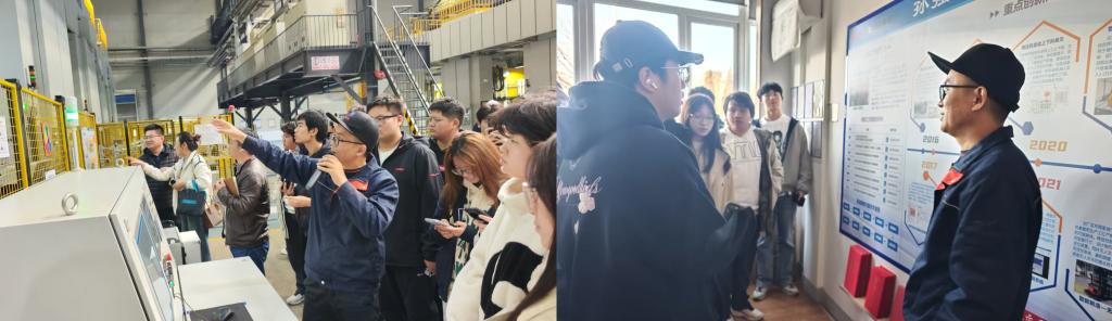 本次参观的核心亮点是 “孙强创新工作室” 的成果展示环节。作为公司技术创新的核心载体,该工作室以自主研发为导向,曾成功打造单工作台自动化生产项目,完成车间数字化系统的自主设计与搭建。工作室技术骨干向师生们详细介绍了这套数字化管理系统的创新亮点:通过硬件改造与程序开发,实现了生产信息、工艺参数、设备状态的实时可视化监控,管理人员可通过电脑终端统筹全局,目前已在集团内部推广应用。此外,工作室研发的模具自动下料装置等专利成果,其在减少人工操作、降低安全风险等方面的实践价值,引发了学生们的热烈讨论。